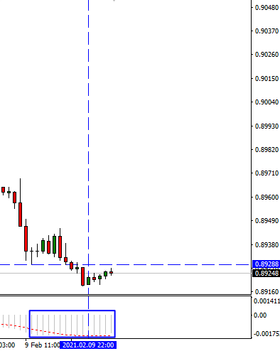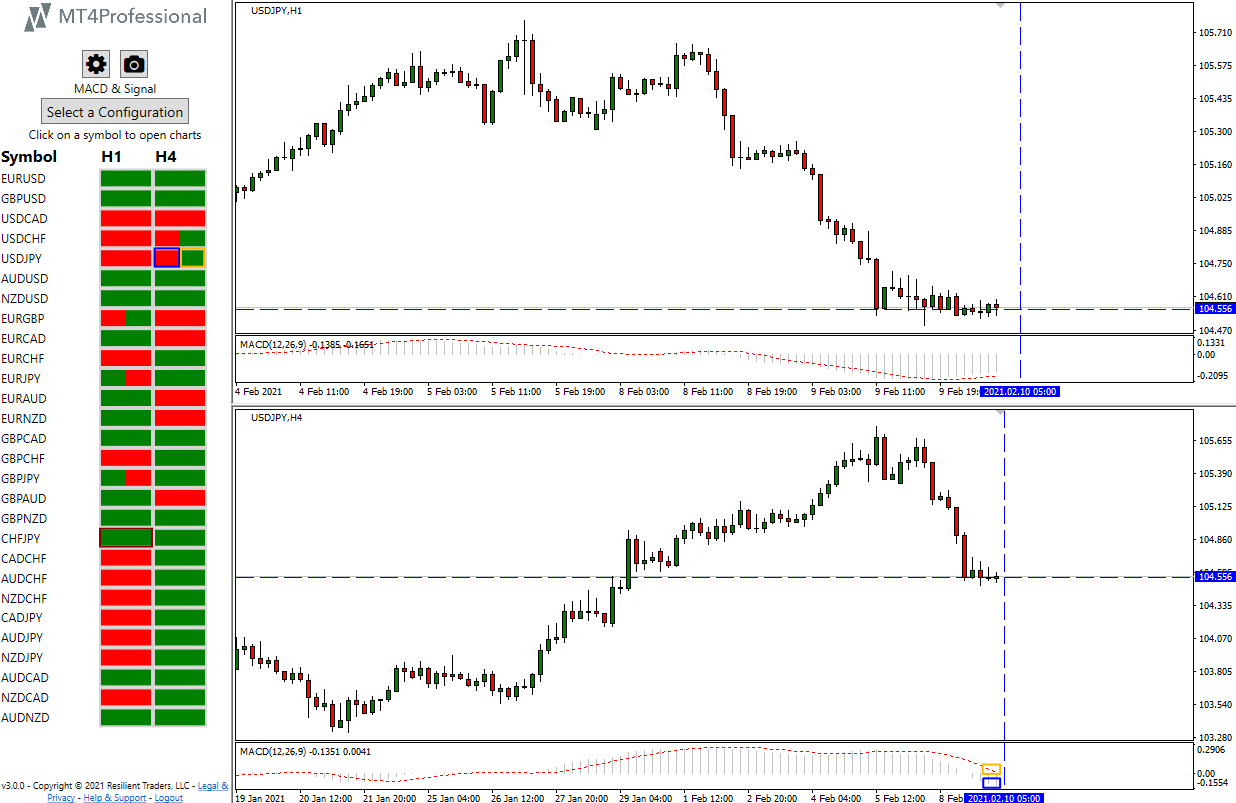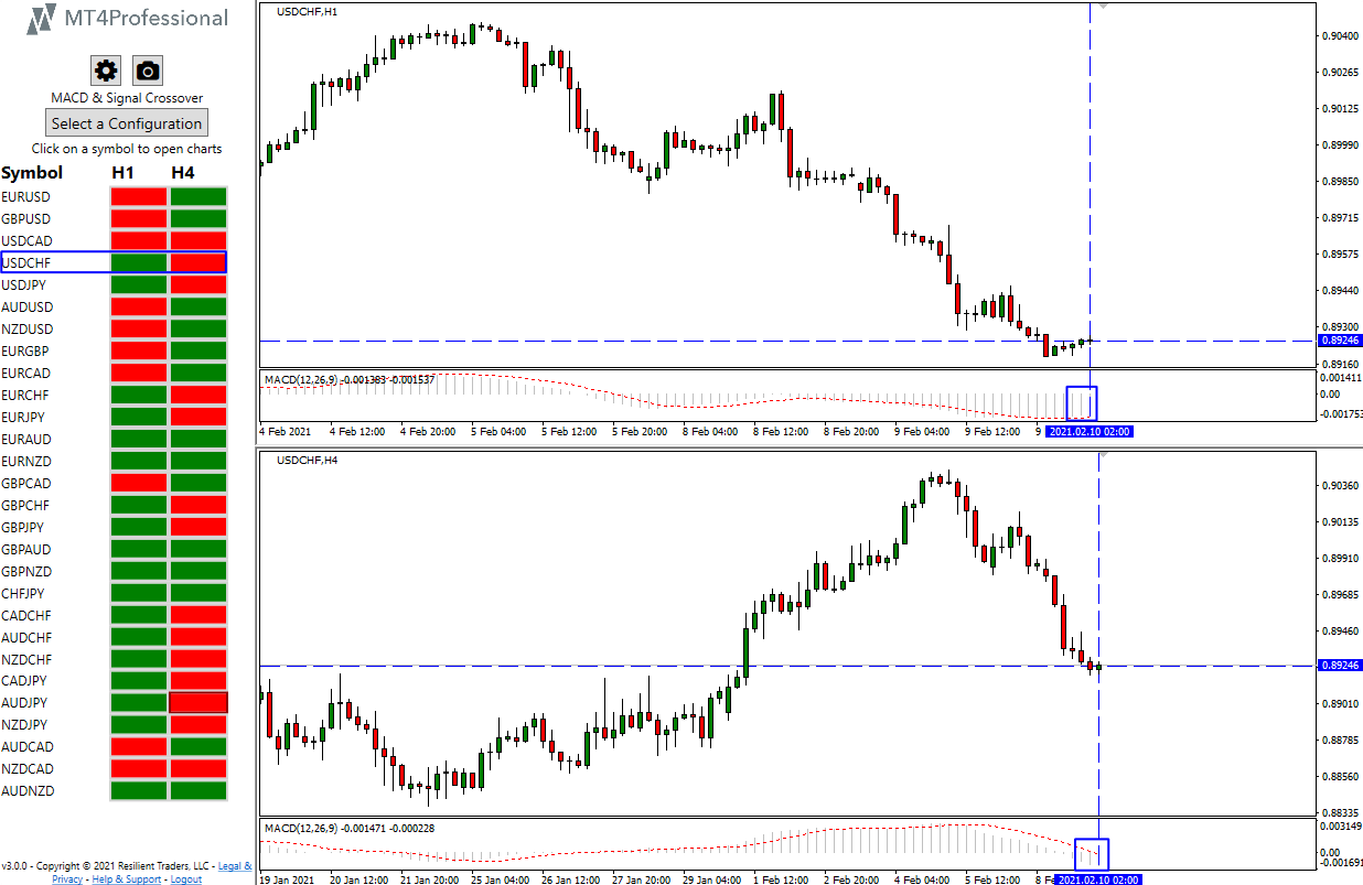 Looking at the previous image, we see for USDCHF, where we have MACD above signal line for H1 and vice-versa for H4. So according to the previous rules, the H1 cell is colored green and the H4 cell is colored red.