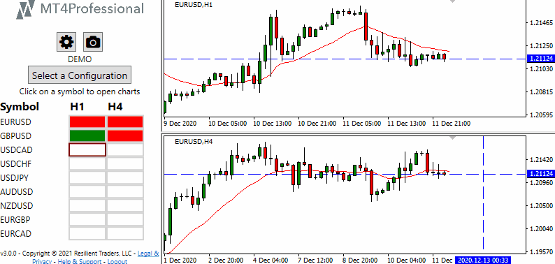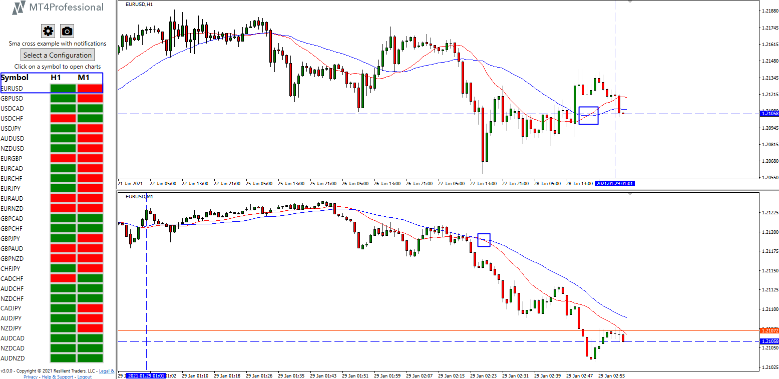 MT4Professional has full market scanner capabilities with alerts notifications. Still, not only this, but it also has other useful features to help you refine opportunities identified via the scanner, such as open symbols charts in one click or multi-timeframe analysis via synced crosshair.