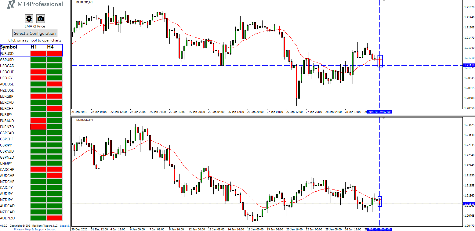 Looking at the previous image, we see for EURUSD that the price is below the EMA for both timeframes (H1 and H4). This trend is confirmed by the scanner where we have red for both cells of EURUSD.