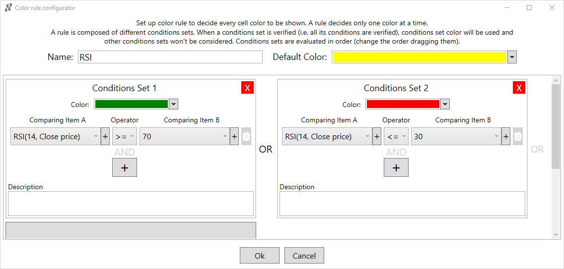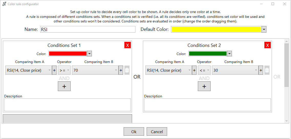 - 30 < RSI < 70: yellow, since we do not expect a trend reversal